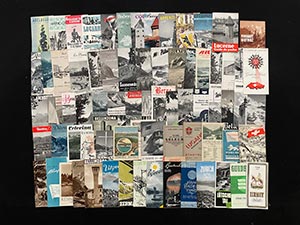 5x5 to 18x25, contains a.o. a stained glass hanger, a stoneware bottle, bookmarks, calendars, stickers, postcard-slides, poster stamps and brochures, all ca. 1958